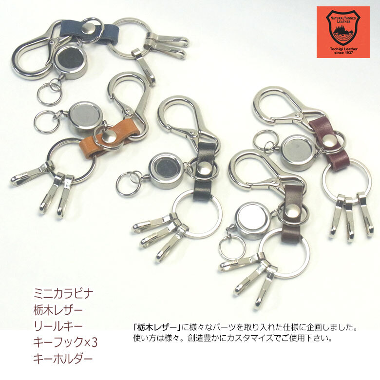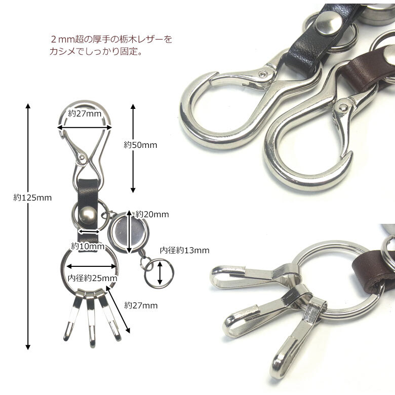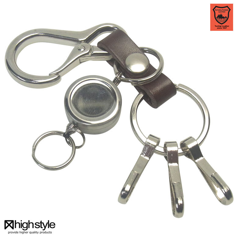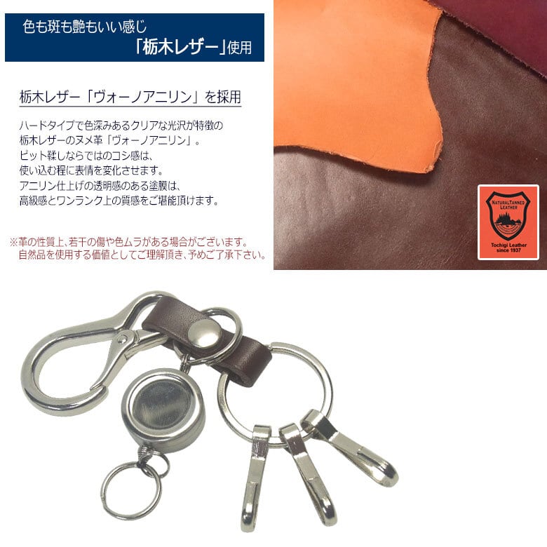 栃木レザー仕様 高級感あるカラビナ&リールキー、キーフック×3付属のキーホルダーです。上質なツヤのある革に上品で高級感ある金具がポイント。デザインと機能性を考えて作られた国産品です