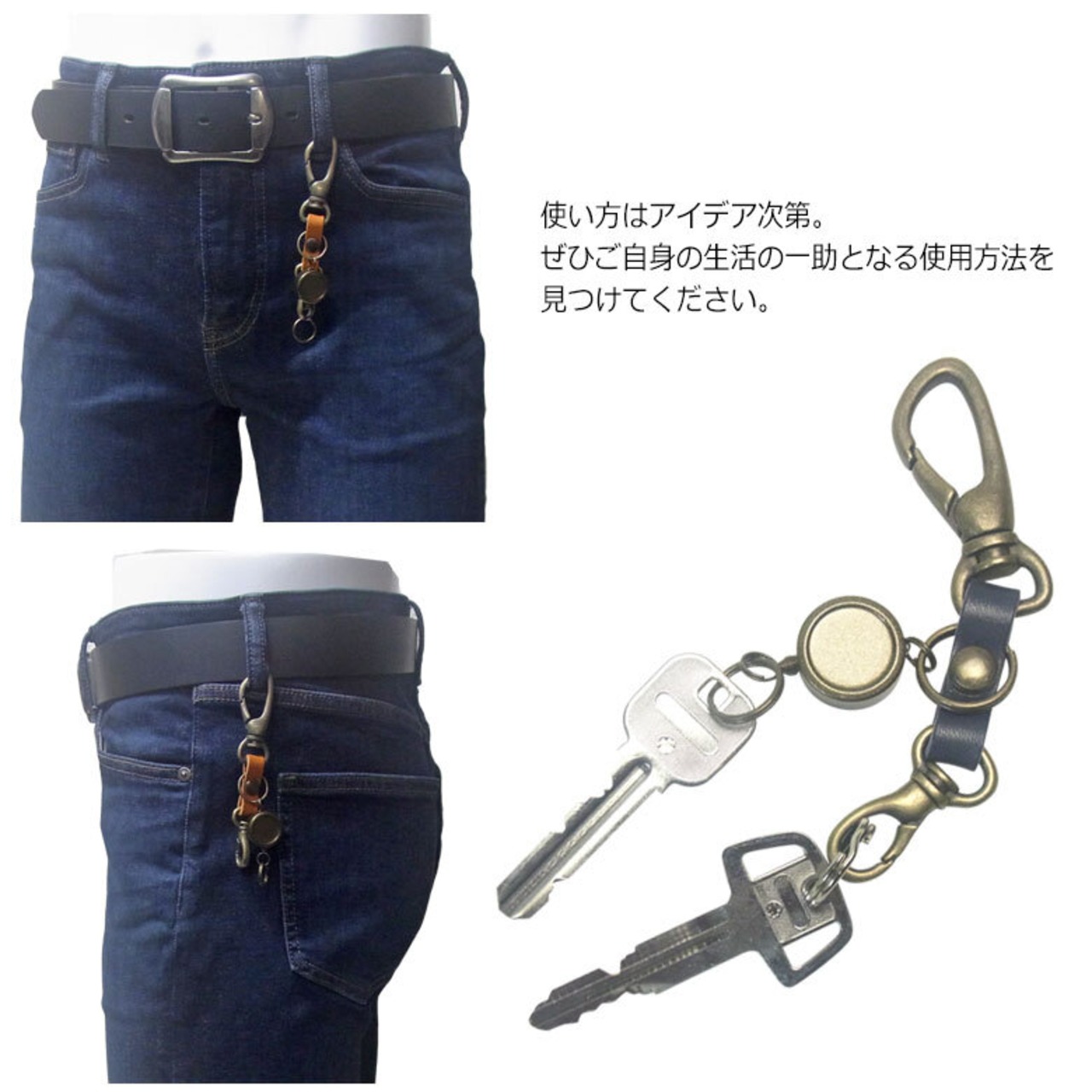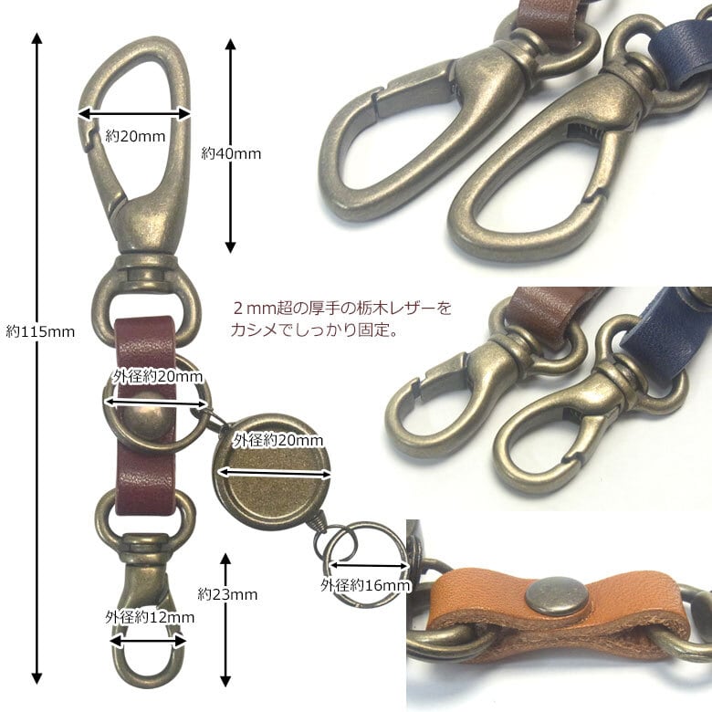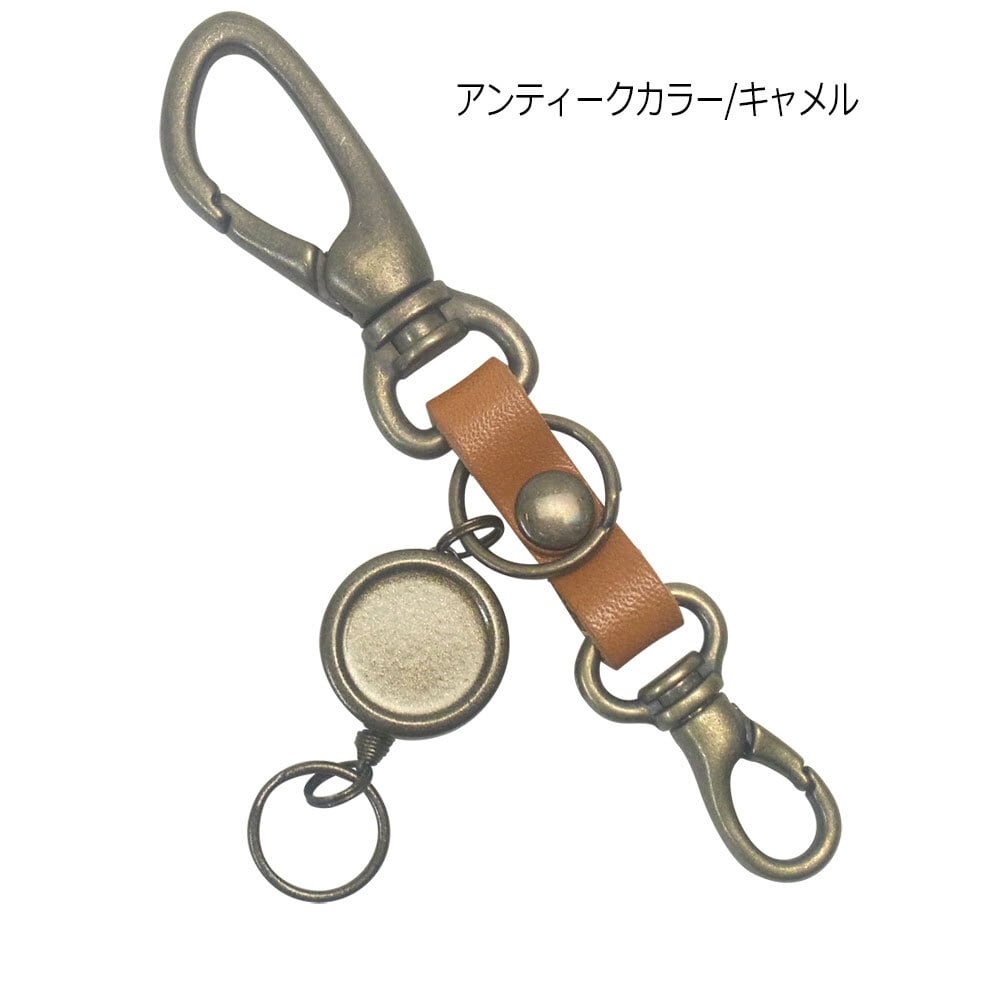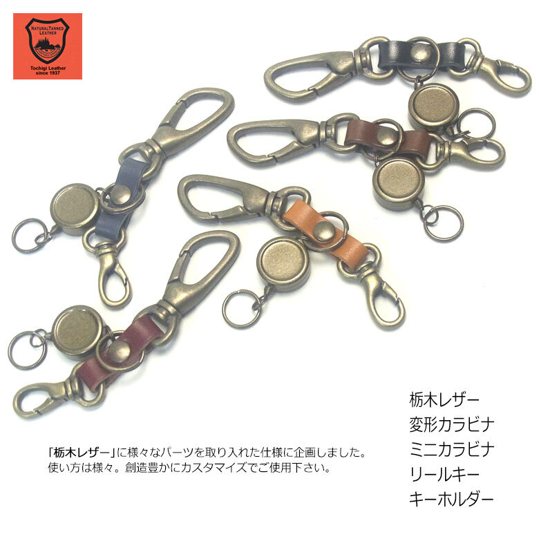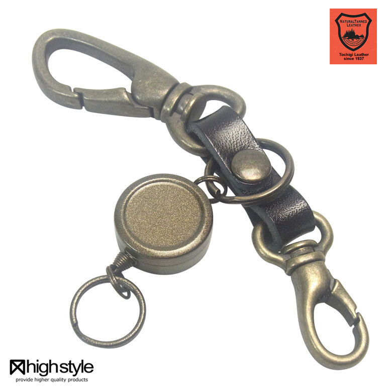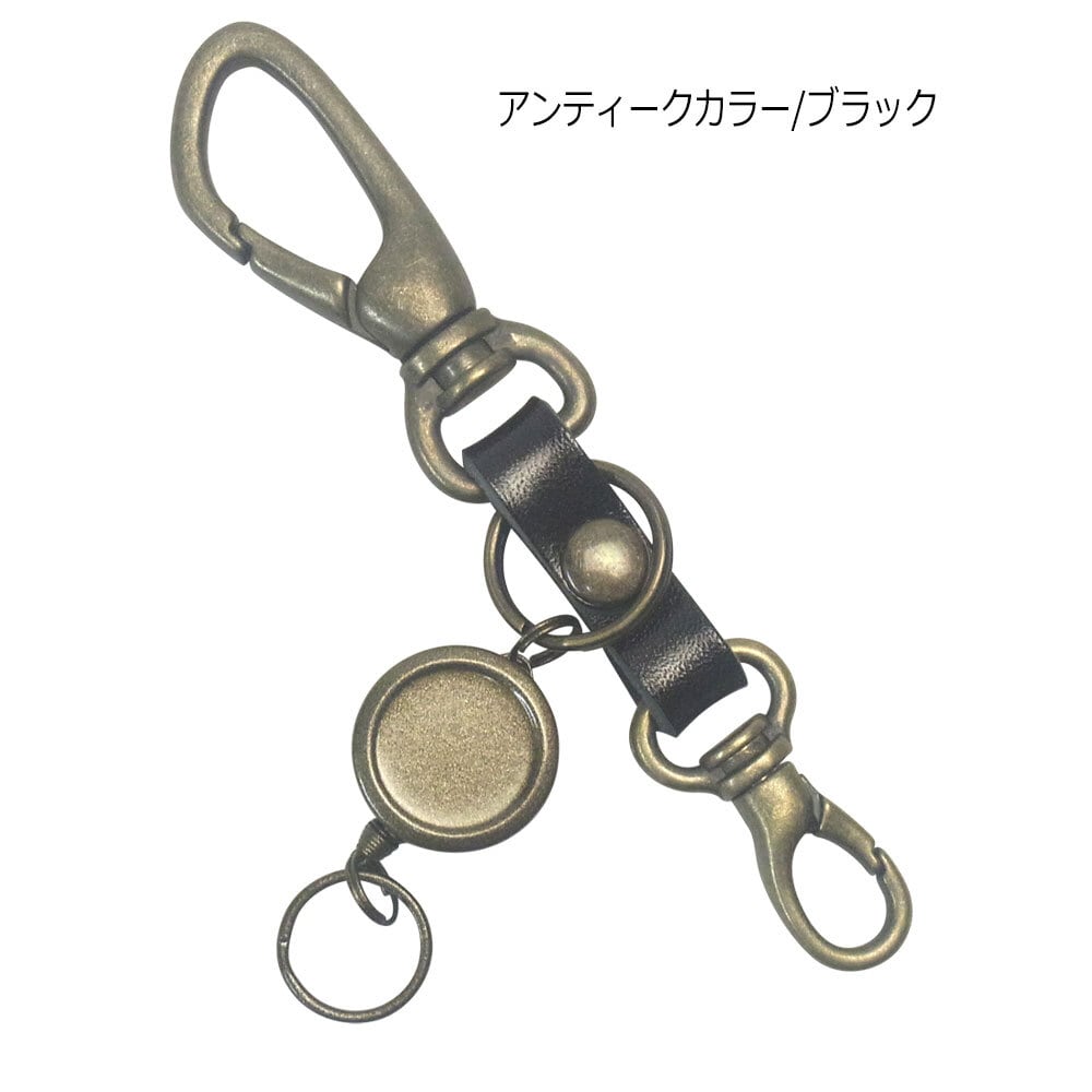 栃木レザー仕様 高級感あるカラビナ&リールキー付きキーホルダーです。上質なツヤのある革に上品で高級なアンティークカラーのメッキ加工金具がポイント。デザインと機能性を考えて作られた国産品です。