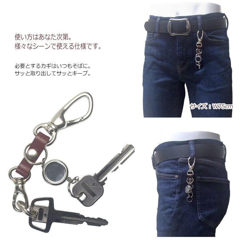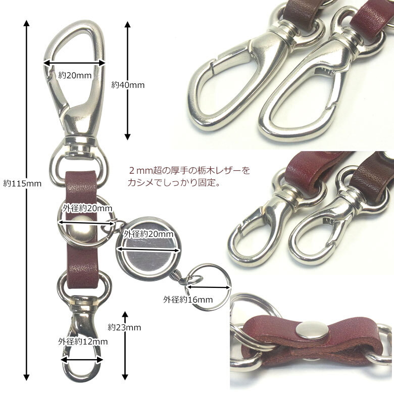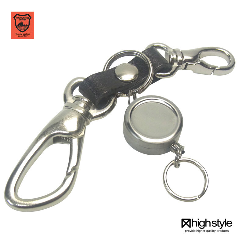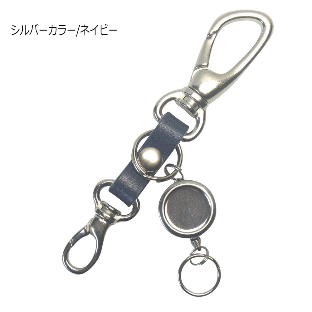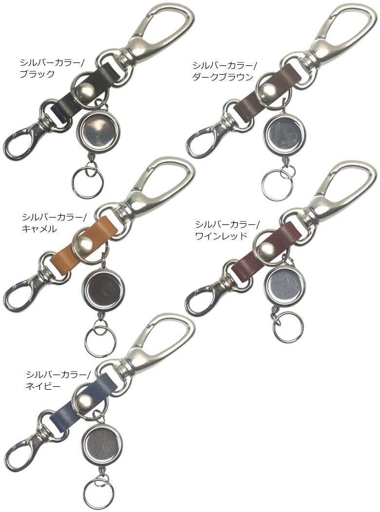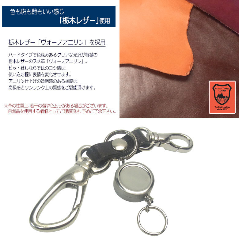 栃木レザー仕様 高級感あるカラビナ&リールキー付きキーホルダーです。上質なツヤのある革に上品で高級なシルバーニッケルカラーの金具がポイント。デザインと機能性を考えて作られた国産品です。
